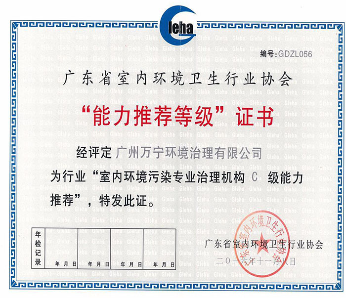• 廣東省室內環境衛生協會證書